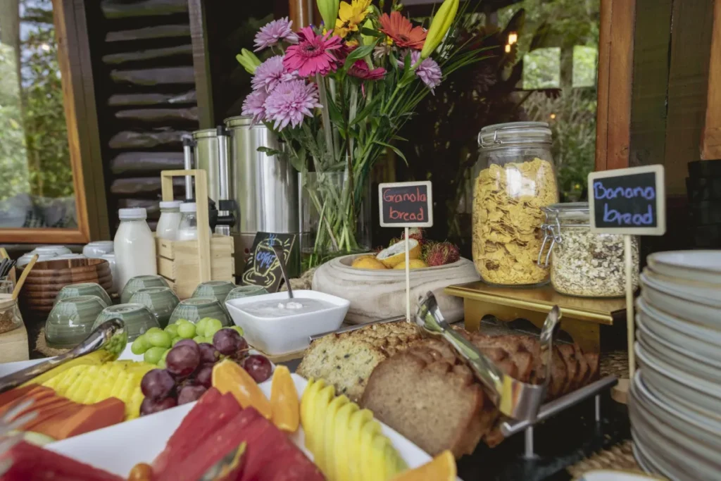 Imagine começar cada dia no terraço, com a névoa envolvendo as montanhas como seda, enquanto um arco-íris de frutas tropicais frescas brilha no seu prato. O aroma rico do café costarriquenho se mistura com a doçura do mamão e do abacaxi maduros, enquanto o Gallo Pinto quente — o amado prato de arroz e feijão do país — ancora você com um sabor de tradição. Cada café da manhã parece menos uma rotina e mais um despertar: vibrante, colorido e cheio de vida.